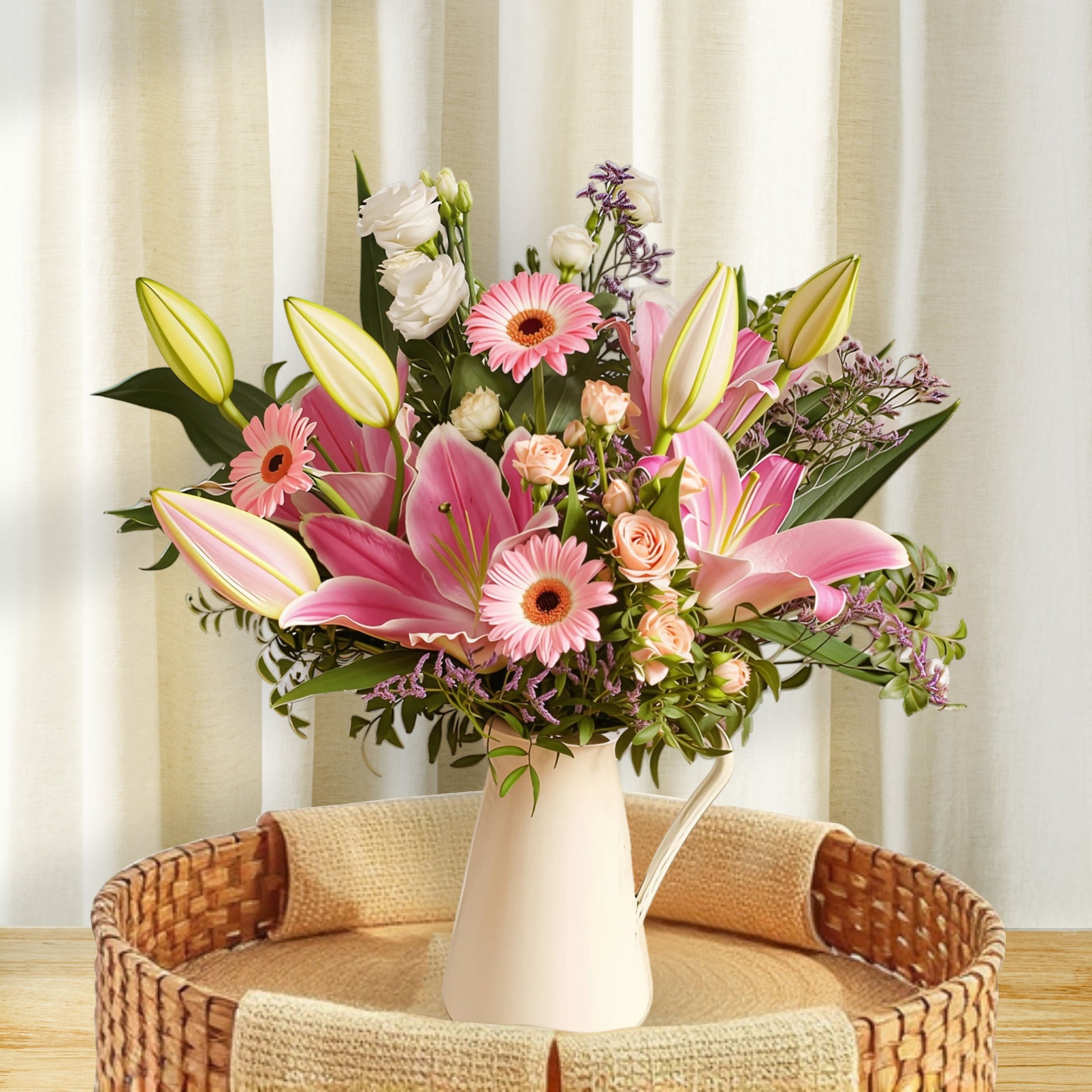 A heartfelt bouquet of germini, lilies and roses, hand-created with sustainably sourced flowers. This arrangement is designed to spark fond memories and is perfect for Easter or any special occasion.