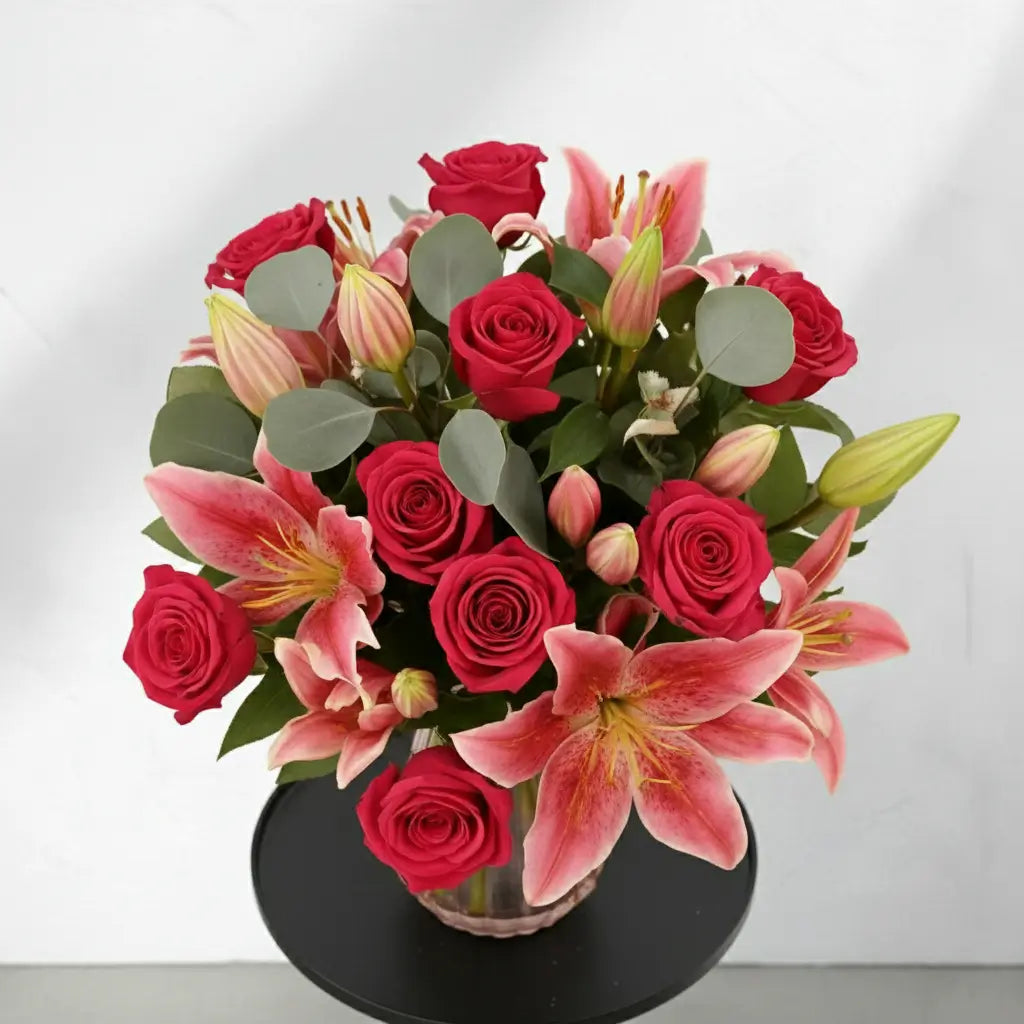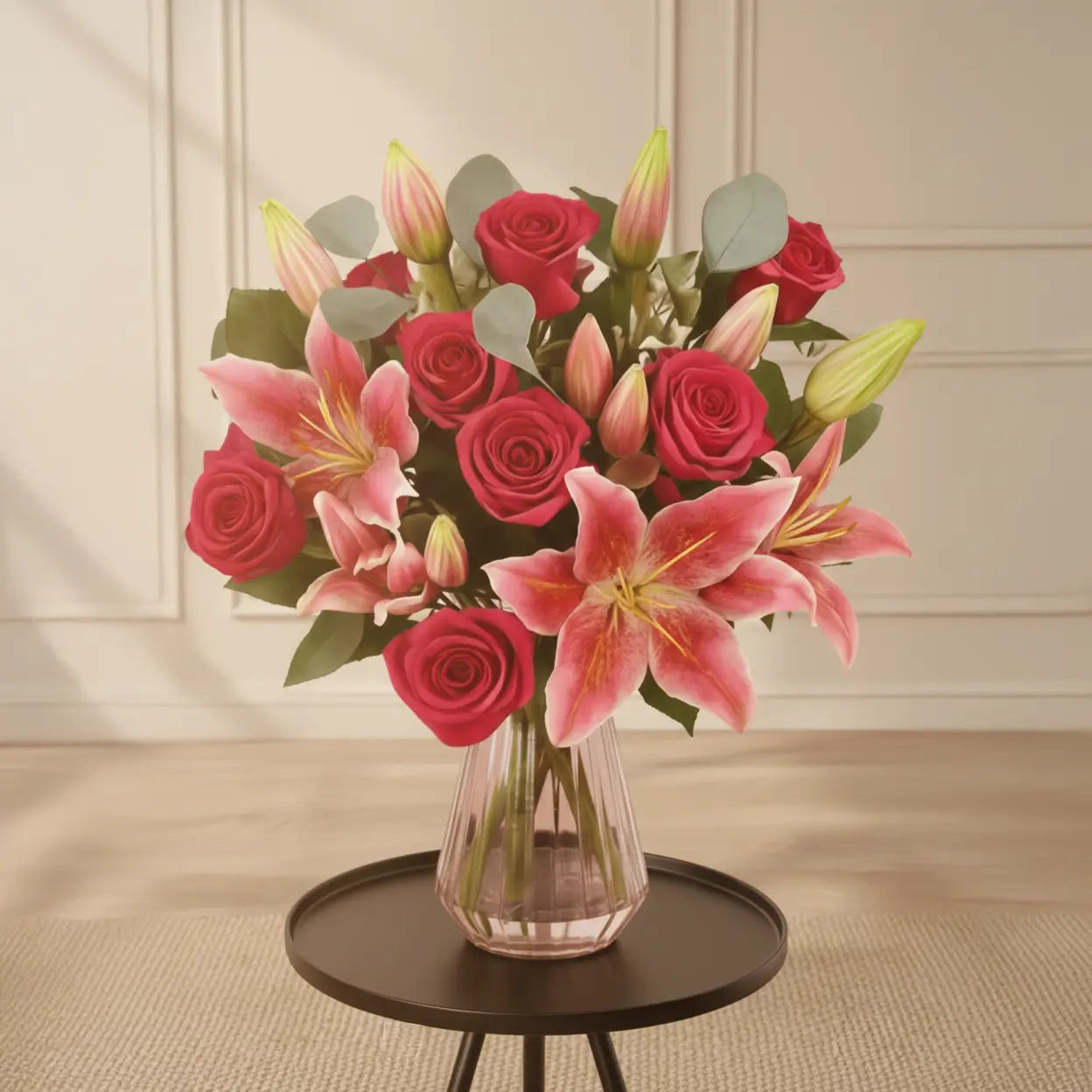 This elegant arrangement features a stunning blend of vibrant pink roses and fragrant Stargazer lilies, beautifully displayed in a modern white ceramic vase. Each bloom is hand-selected for freshness, creating a luxurious composition full of colour, texture and natural charm. The mix of open lilies, delicate buds and classic roses adds depth and movement, making it an ideal centrepiece for any home or a thoughtful gift for someone special. Perfect for birthdays, anniversaries or simply brightening someone’s day, this stylish vase arrangement brings beauty and joy to any space with its fresh, uplifting presence.