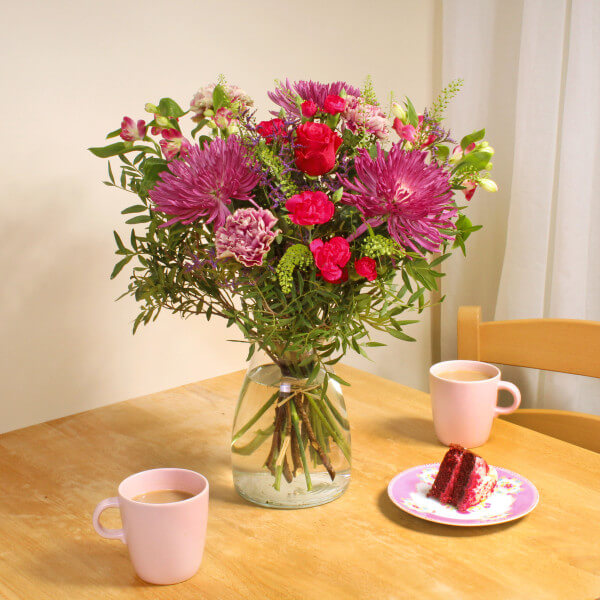A delicate hand-tied of purple and pink carnations with chrysanthemums. Feminine, elegant and perfect for gifting someone special.