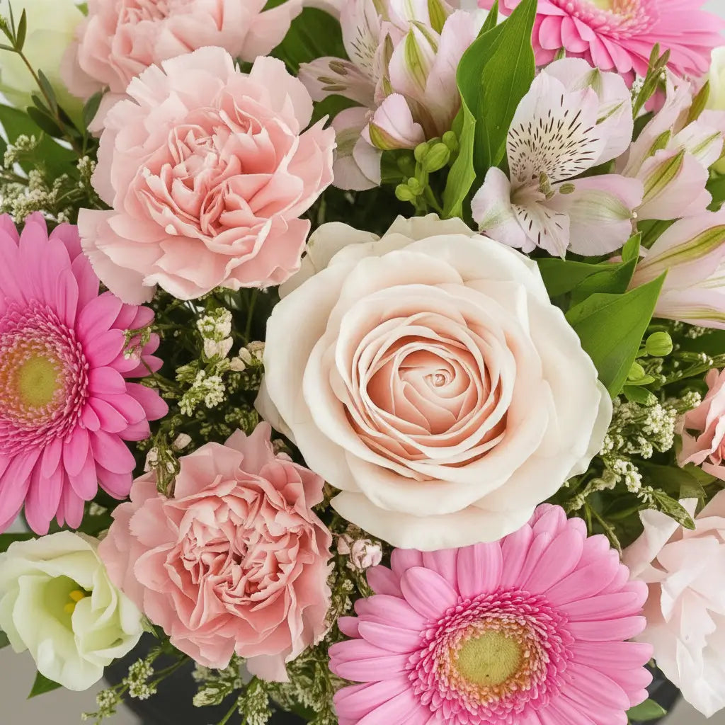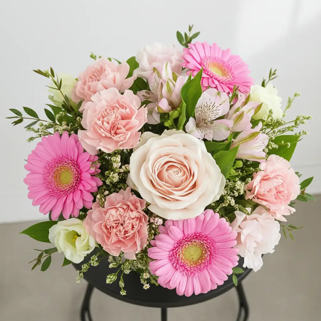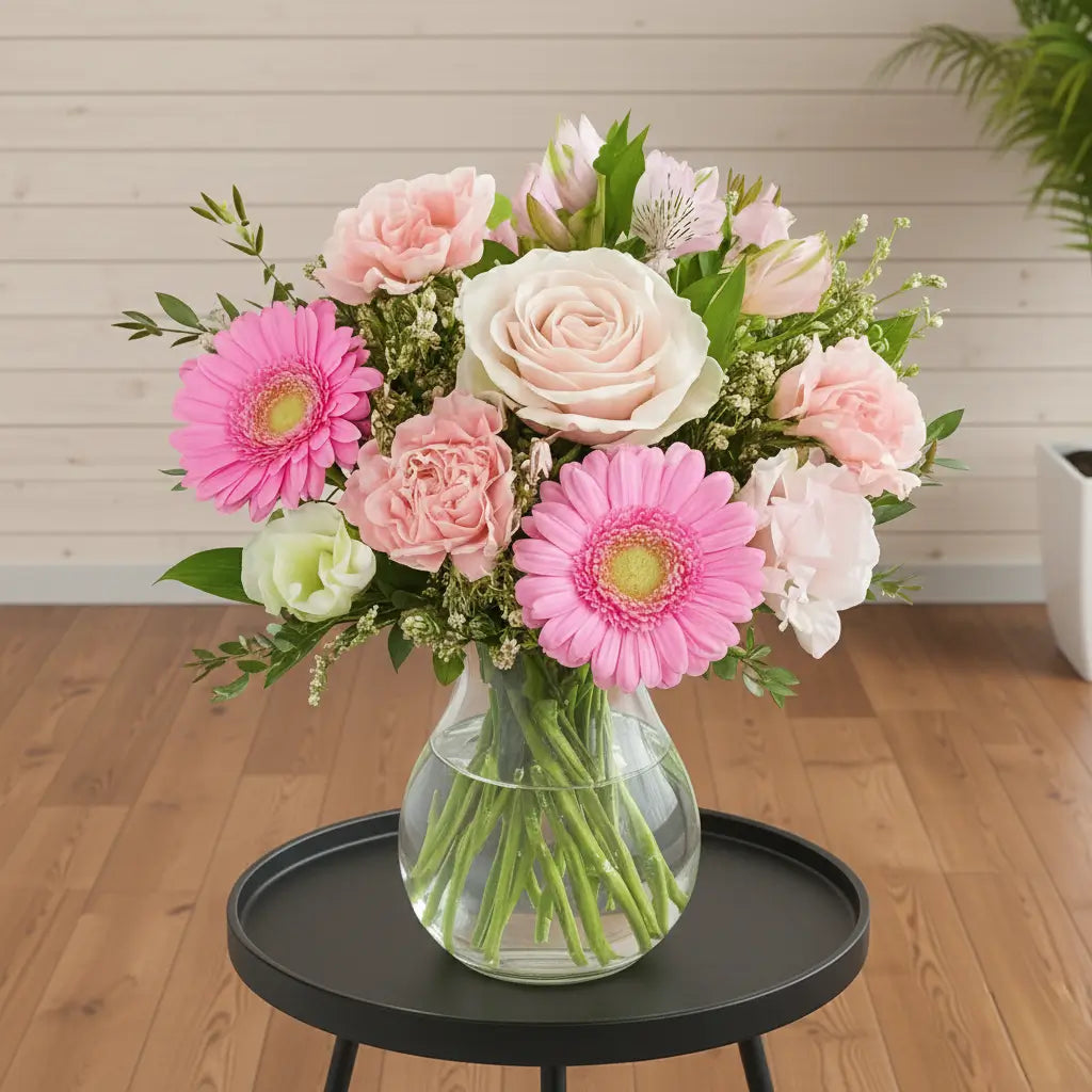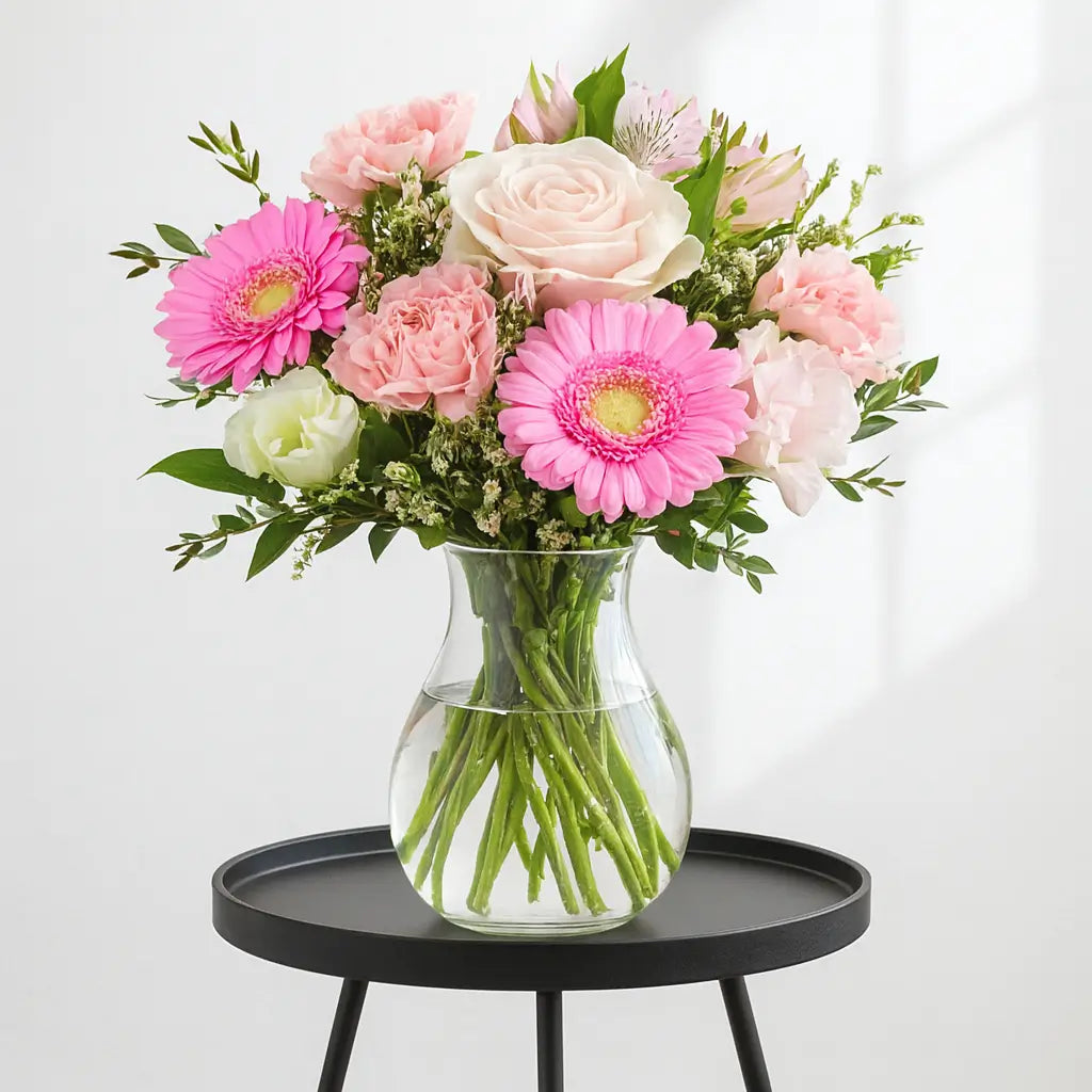 A cheerful, feminine arrangement featuring bright pink gerberas, soft blush roses, lisianthus, and delicate spray carnations. Styled with fresh greenery and presented in a classic clear glass vase, this bouquet feels uplifting, sweet, and full of charm. Perfect for birthdays, thank-yous, get-well wishes, or simply brightening someone’s day with a burst of pink happiness.