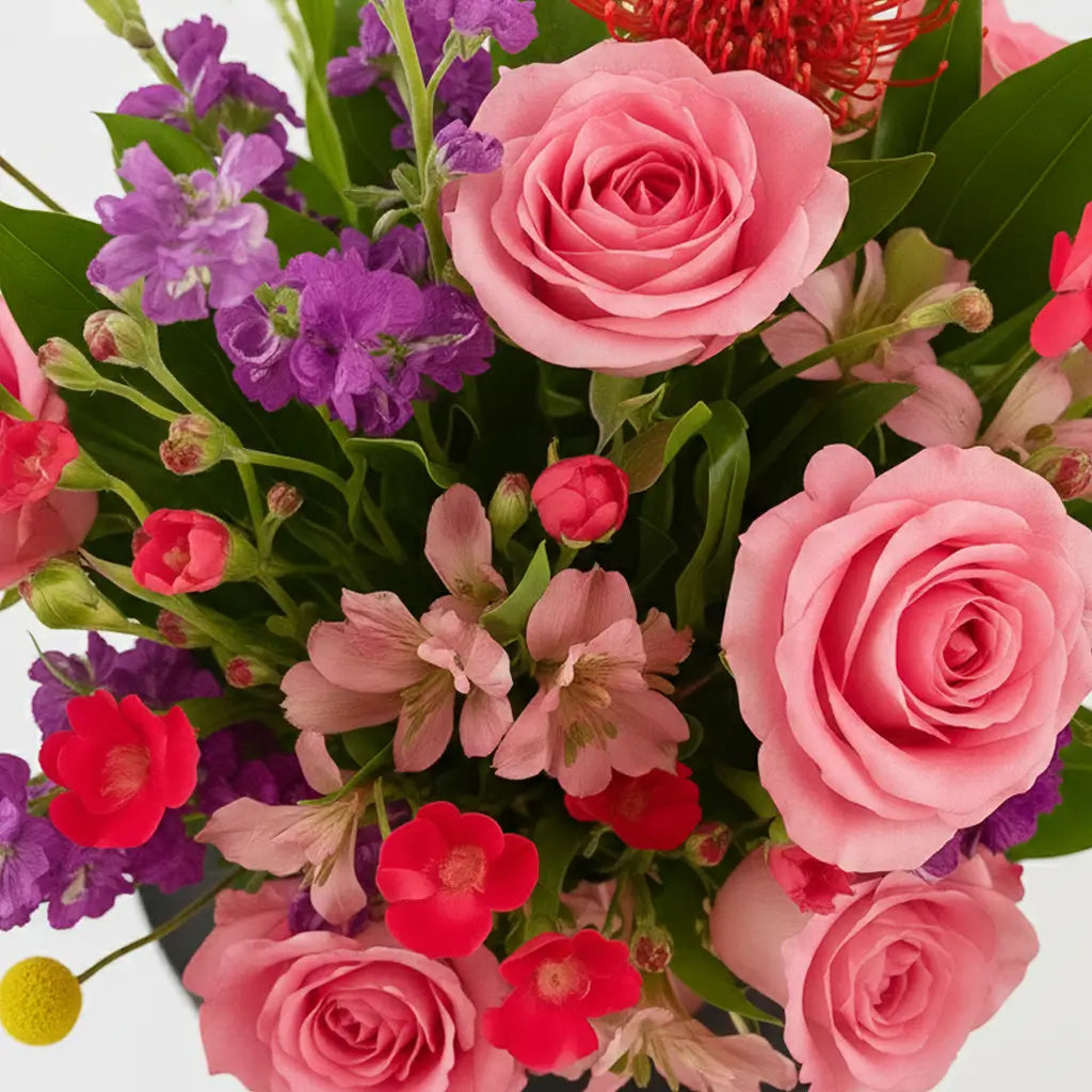 Bright, uplifting, and charming — this pink vase arrangement brings together soft pink roses, lilac stocks, blush alstroemeria, and vibrant pops of cerise blooms. Accented with craspedia and lush greenery, it creates a cheerful yet elegant silhouette perfect for sending love, thanks, or celebration. Styled in a ribbed rose-tinted glass vase for a modern UK-florist finish, this arrangement adds instant warmth to any home.
