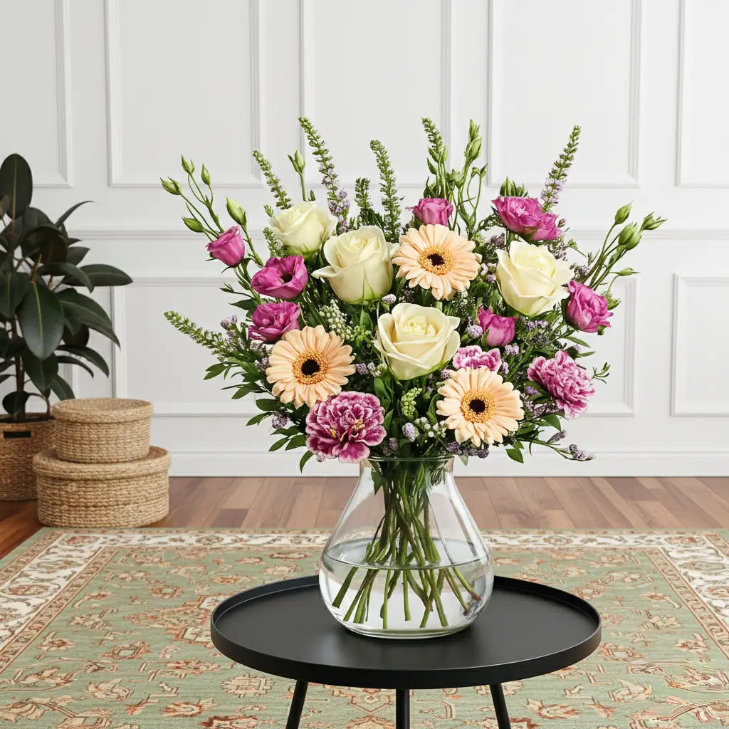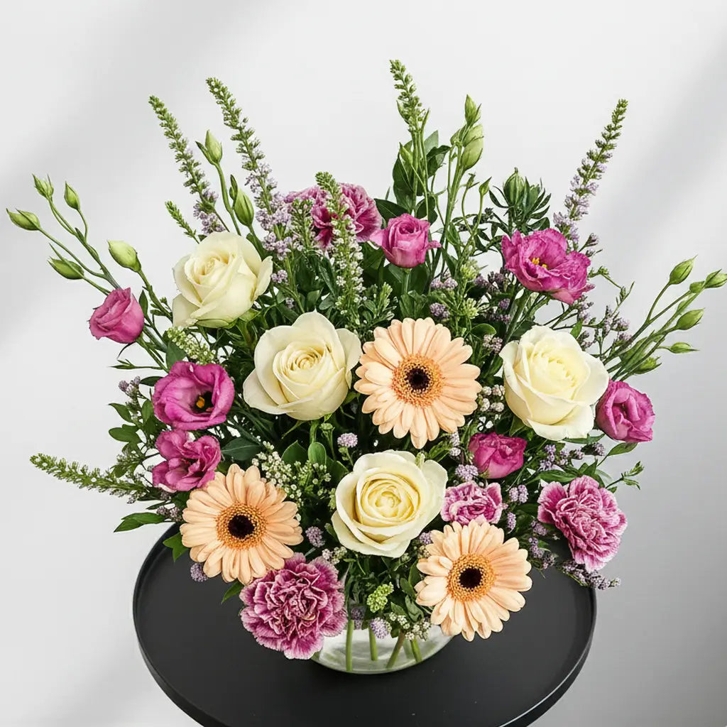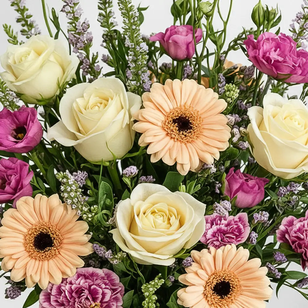 The Elise is a soft and uplifting bouquet featuring creamy roses, peach gerberas, lilac lisianthus, and ruffled pink carnations arranged in a fresh, airy style. With its gentle pastel palette and naturally elegant silhouette, this arrangement brings a touch of calm beauty to any home. Perfect for birthdays, thank-yous, or simply brightening someone’s day, The Elise blends charm, freshness, and understated luxury.