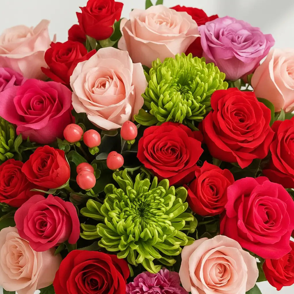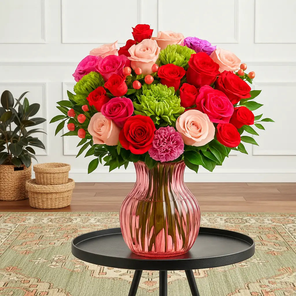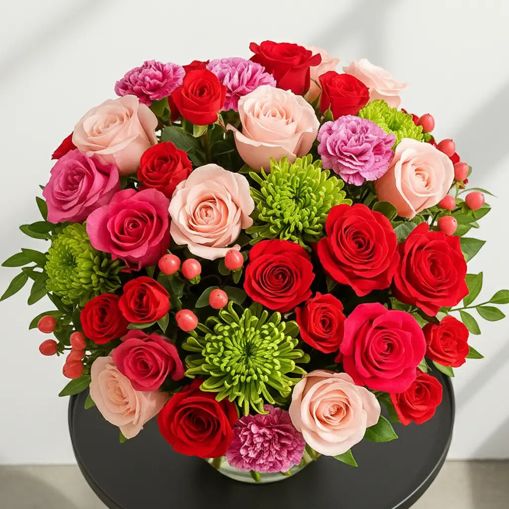 Bold, luxurious, and full of colour, this arrangement brings together red, pink, and blush roses with green chrysanthemums, pink carnations, and berry-red hypericum. Designed in a classic clear glass vase, it creates a rich, indulgent display perfect for romantic gestures, special celebrations, or simply treating someone to something truly beautiful. Its striking mix of vibrant and soft tones offers a modern, premium UK-style look that stands out in any home.