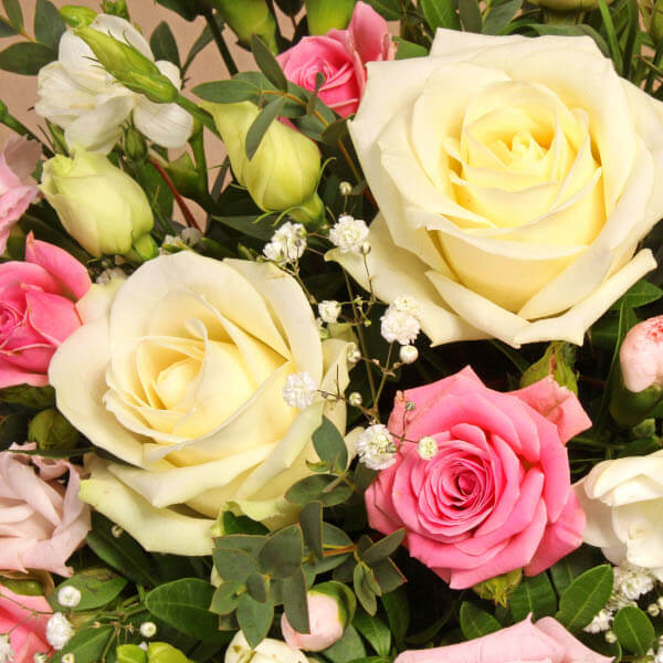 A versatile pastel hatbox brimming with freesias and roses. Gentle and elegant, this hand-crafted arrangement suits weddings, birthdays, funerals, or simply as a thoughtful gift for someone special.