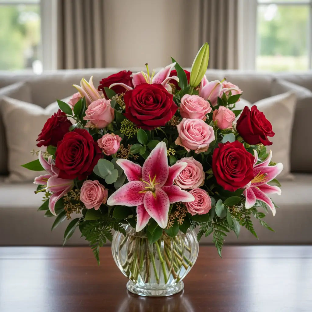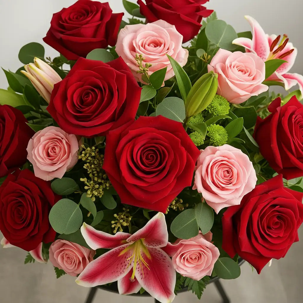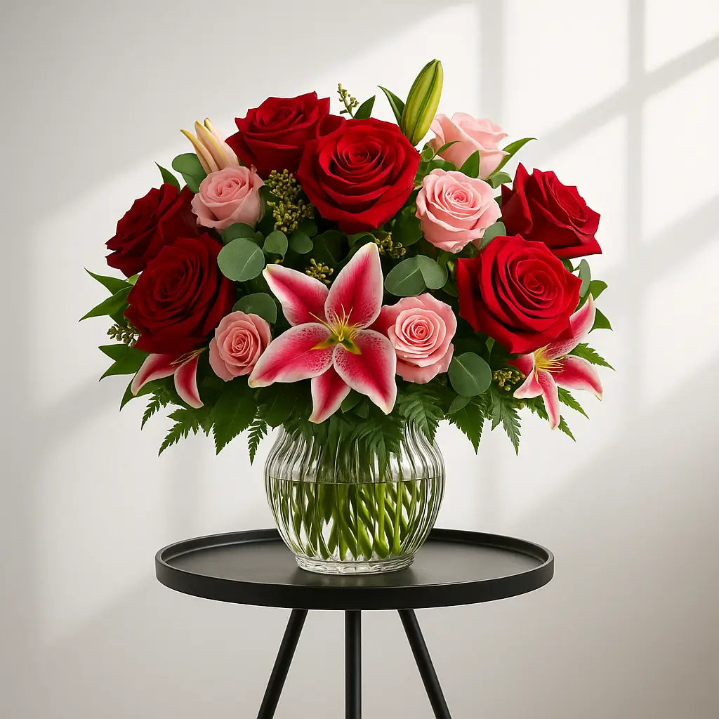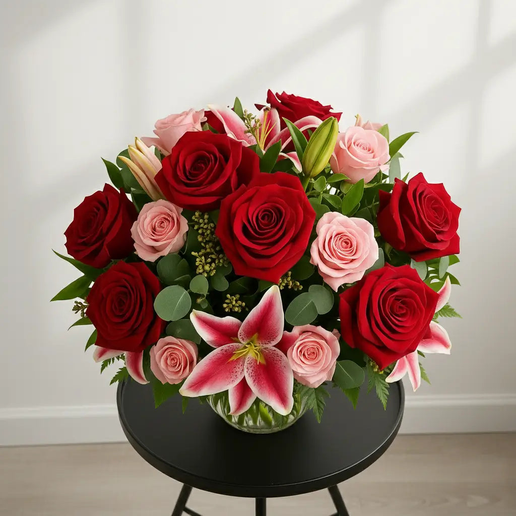 A beautifully romantic arrangement combining deep red roses, soft pink roses, and striking stargazer lilies. Accented with lush greenery and arranged in a classic rounded ribbed glass vase, this bouquet feels luxurious, expressive, and perfect for heartfelt moments. Ideal for anniversaries, Valentine’s surprises, or any occasion where love deserves to be celebrated in full colour.